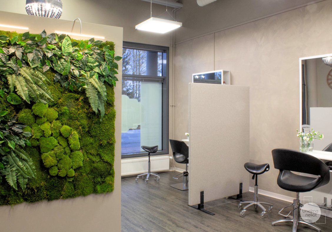 Kun menet Hiussalin Kuntiksen toimipisteeseen, niin se näyttää siltä, että oikealla on asiakaspaikat, vasemmalla tuotehyllyt ja myyntitiski, takaosassa pesupaikat sammalseinänäkymineen. Että ne on vaan laitettu siihen. Mutta ei todellakaan ole…