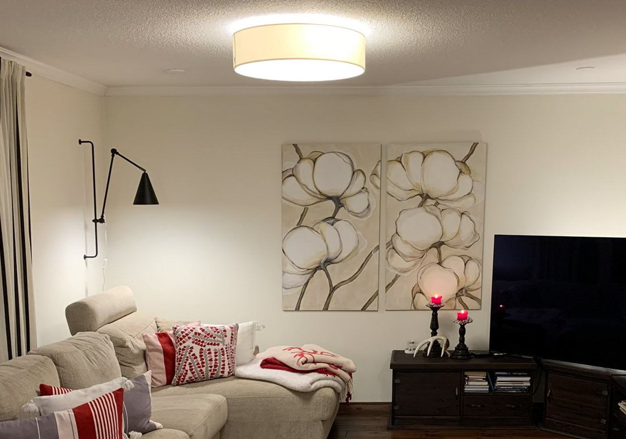 Olohuoneen kattoon valittiin iso, halkaisijaltaan 70 cm oleva, matalahko plafondi, jonka varjostin on vaaleaa villaa. Se sopii täydellisesti taulujen ja seinien väreihin. Siitä saadaan kunnon yleisvalo ja se voidaan säätää myös todella himmeäksi, jolloin se luo tunnelmallisen yleisvalon.